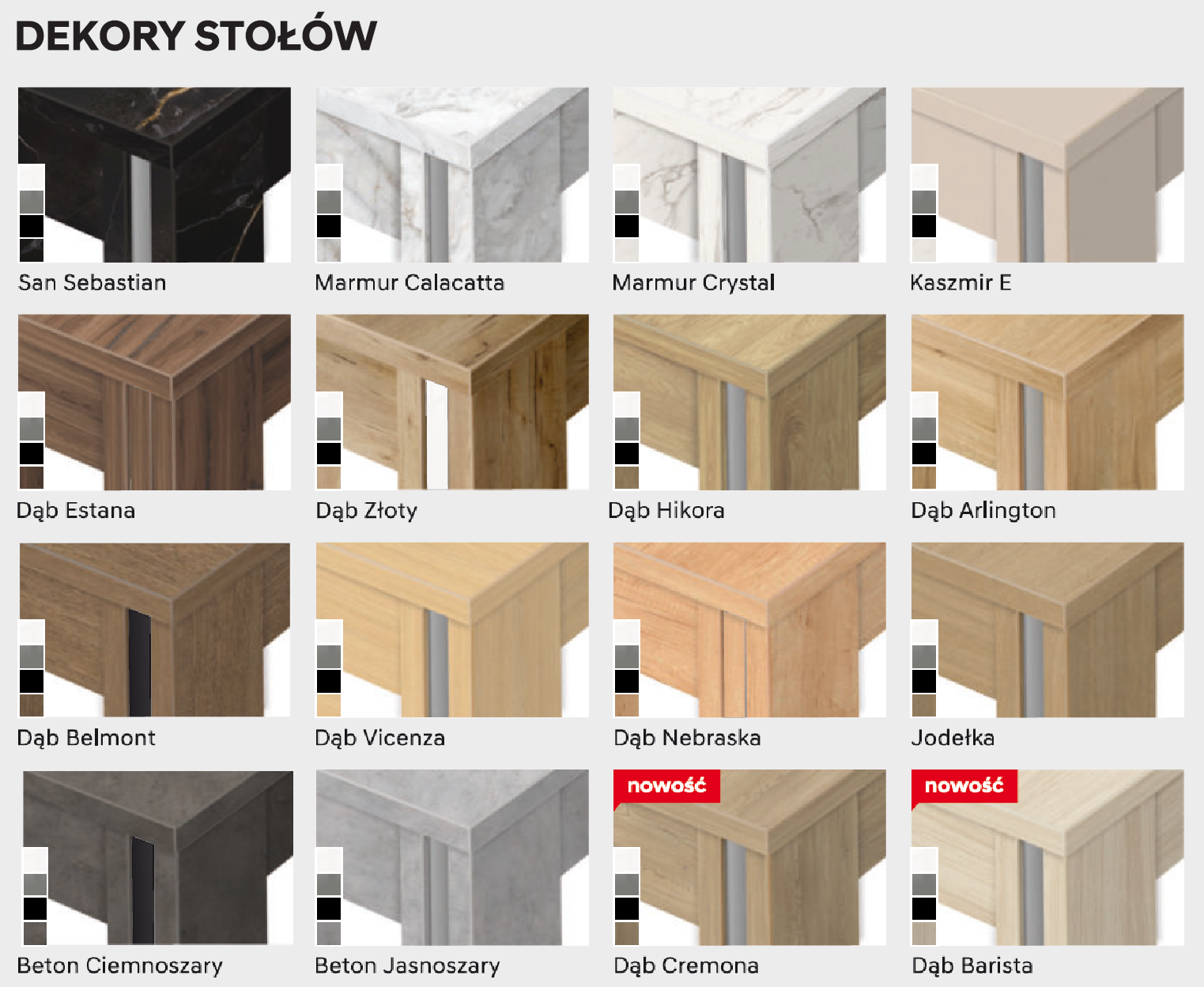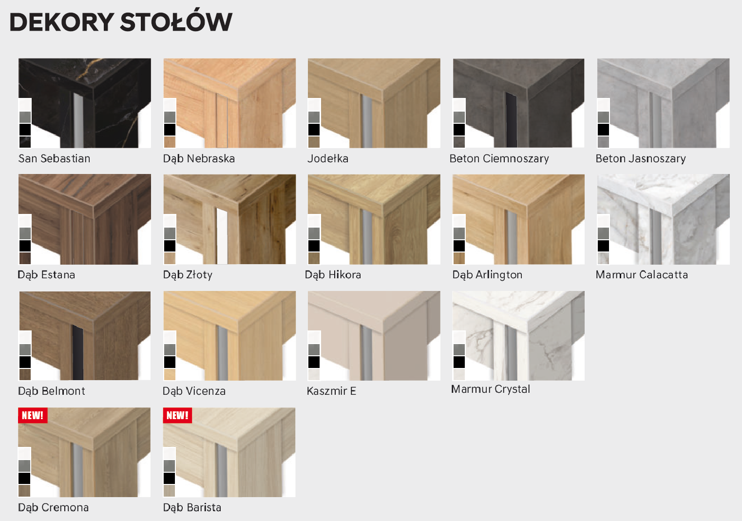 Nogi stołów wyróżniają się ozdobnym wypełnieniem, dostępnym w trzech klasycznych kolorach: białym, szarym lub czarnym. Wybierz idealne połączenie, takie jak: