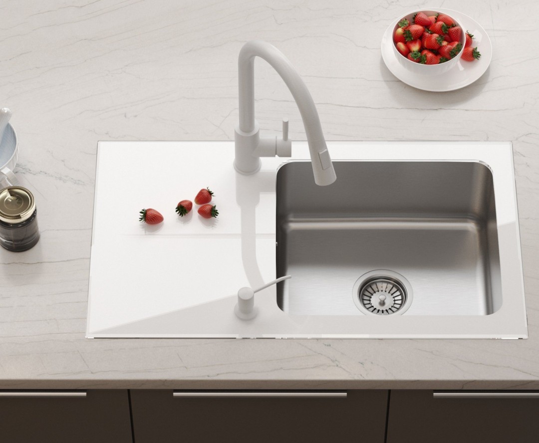 Zlewozmywak kuchenny Hugh 111 – stal i białe szkło hartowane