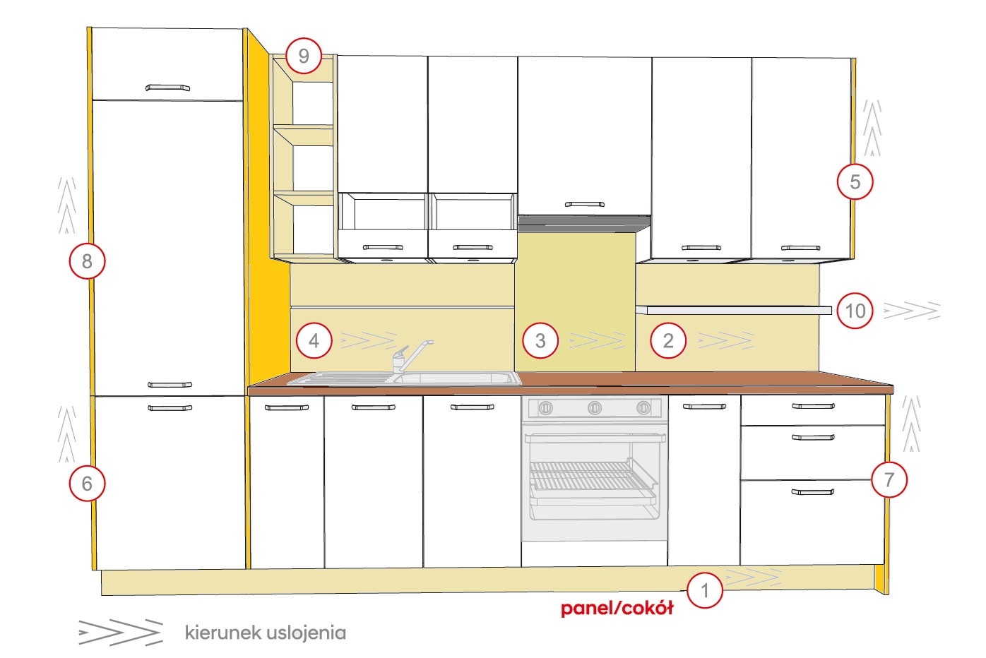 - Elementy wykończeniowe – panele, cokoły, półki, formatki