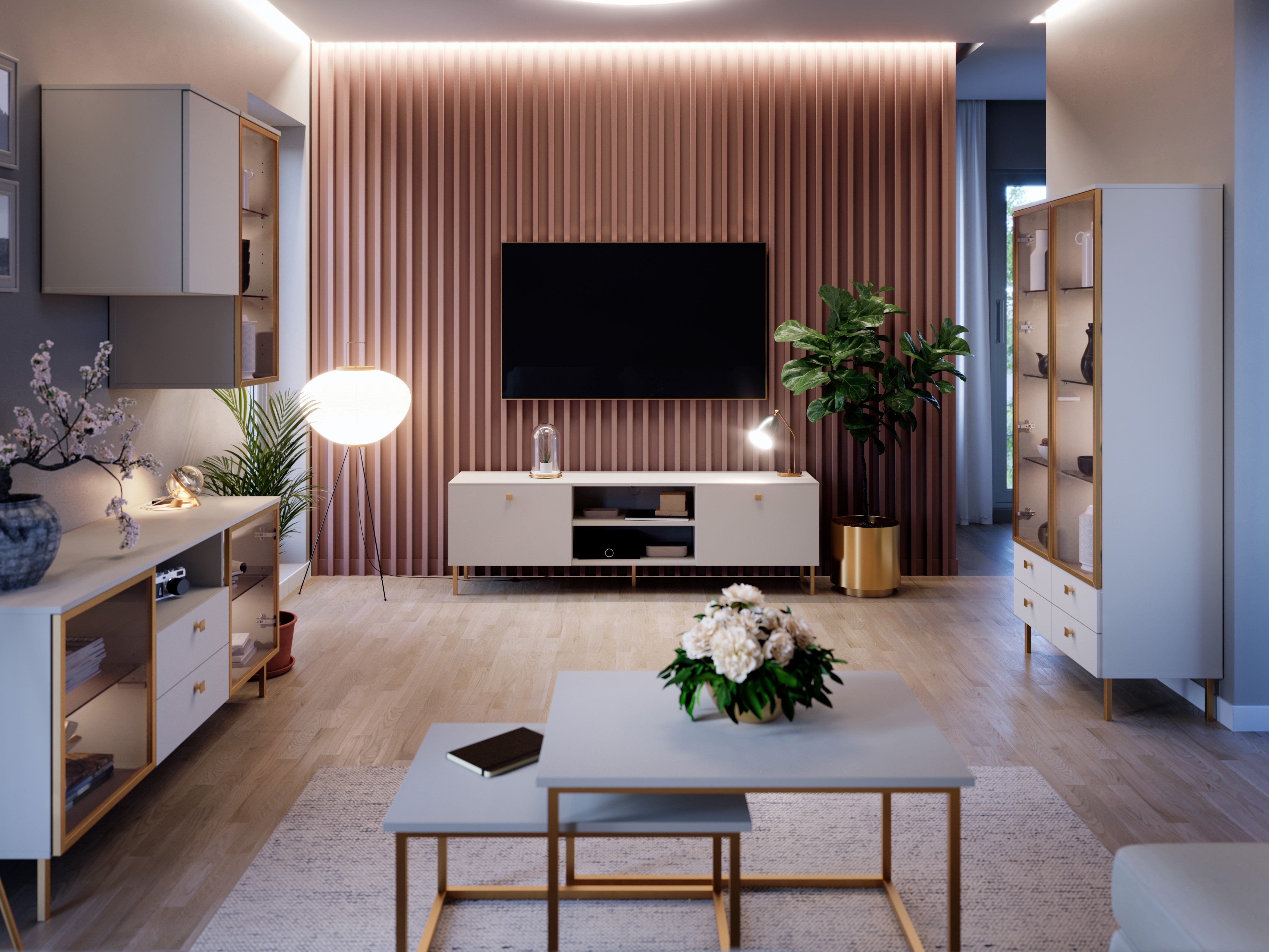 Komoda Kiss K-KOM3 to nowoczesny mebel łączący elegancję, funkcjonalność i precyzję wykonania. Wersja Kaszmirowe Złoto przyciąga wzrok subtelnym matem i ekskluzywnym wykończeniem, doskonale wpisując się w aranżacje nowoczesne, loftowe oraz glamour.