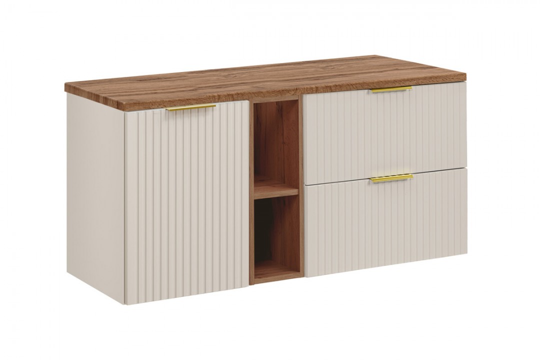 Charakterystyczne ryflowane fronty wykonane z trwałej płyty MDF podkreślają ekskluzywny charakter mebla. W zestawie znajdziesz trzy warianty uchwytów – złoty połysk, chrom połysk oraz czarny mat – które pozwolą Ci dopasować wygląd szafki do stylu Twojej łazienki.