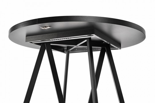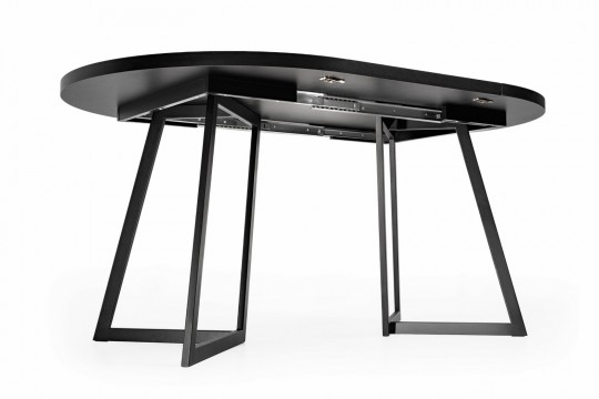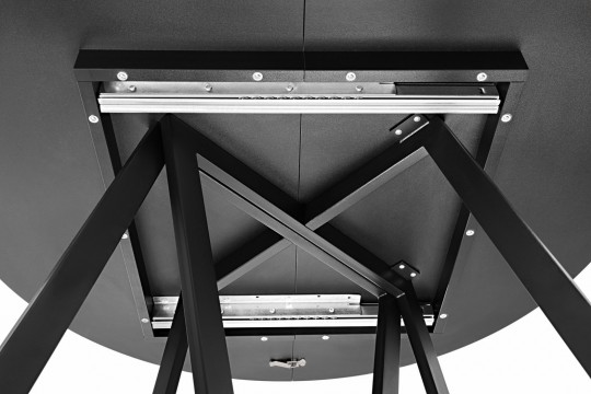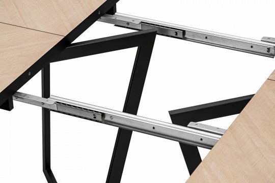 Stół Vikam VSB 2 wyposażony jest w czarne, metalowe nogi malowane proszkowo, wykonane w formie ramowej z dodatkową podporą stabilizującą blat. Taka konstrukcja zapewnia wyjątkową stabilność nawet po rozłożeniu stołu oraz podkreśla nowoczesny, loftowy charakter mebla.