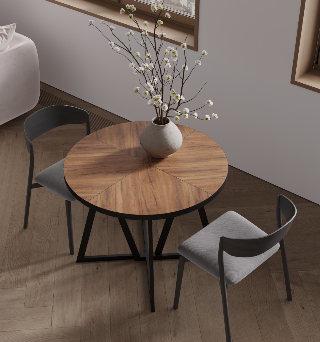 Vikam VSB 2 to nowoczesny okrągły stół rozkładany do kuchni i jadalni, zaprojektowany z myślą o funkcjonalnych i estetycznych wnętrzach. Czarny, metalowy stelaż z blatem w dekorach dopasowanych do frontów mebli kuchennych Kam.