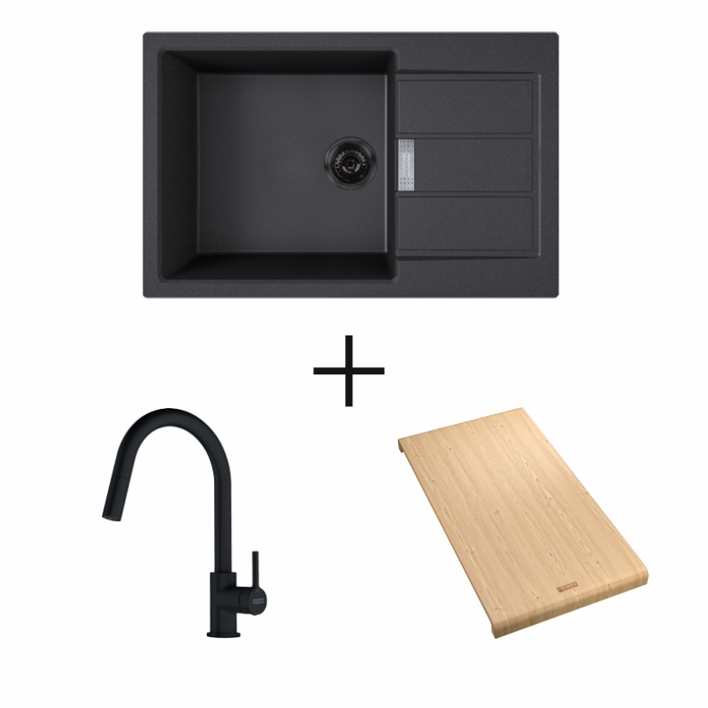 Kompletny zestaw kuchenny T4 to idealne rozwiązanie dla osób, które oczekują nowoczesnego designu, wysokiej funkcjonalności oraz spójnej estetyki. Zestaw łączy w sobie zlewozmywak z ociekaczem T4, baterię kuchenną B8 z wyciągana wylewką w czarnym macie oraz praktyczną deskę bambusową, tworząc komfortową i elegancką strefę zmywania.