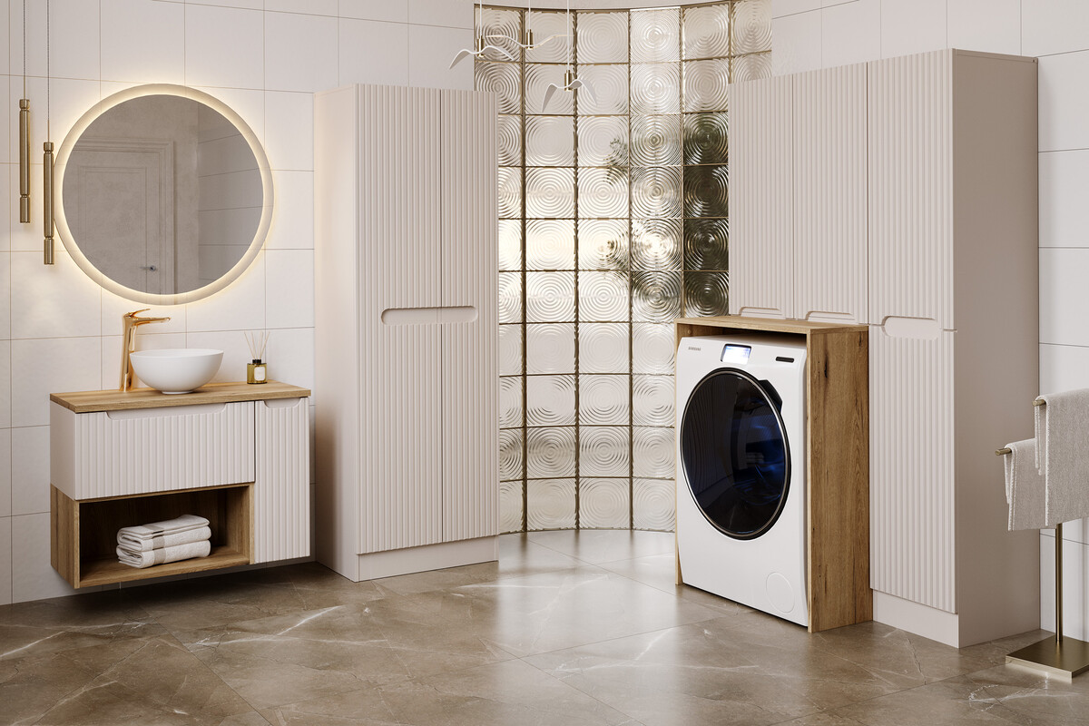 Obudowa pralki stanowi element kolekcji Nova Cashmere – naszej pierwszej linii mebli, która umożliwia stworzenie zabudowy meblowej z funkcją pralni. Dzięki temu możesz zaprojektować kompleksową przestrzeń obejmującą miejsce na pralkę, kosze na pranie oraz dodatkowe strefy przechowywania, zachowując pełną spójność stylistyczną.