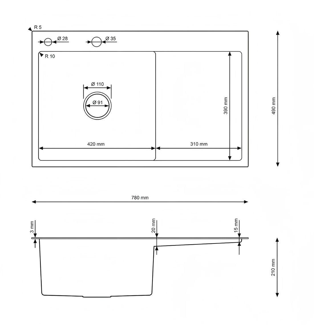 - wymiary zlewozmywaka: 780mm × 490mm